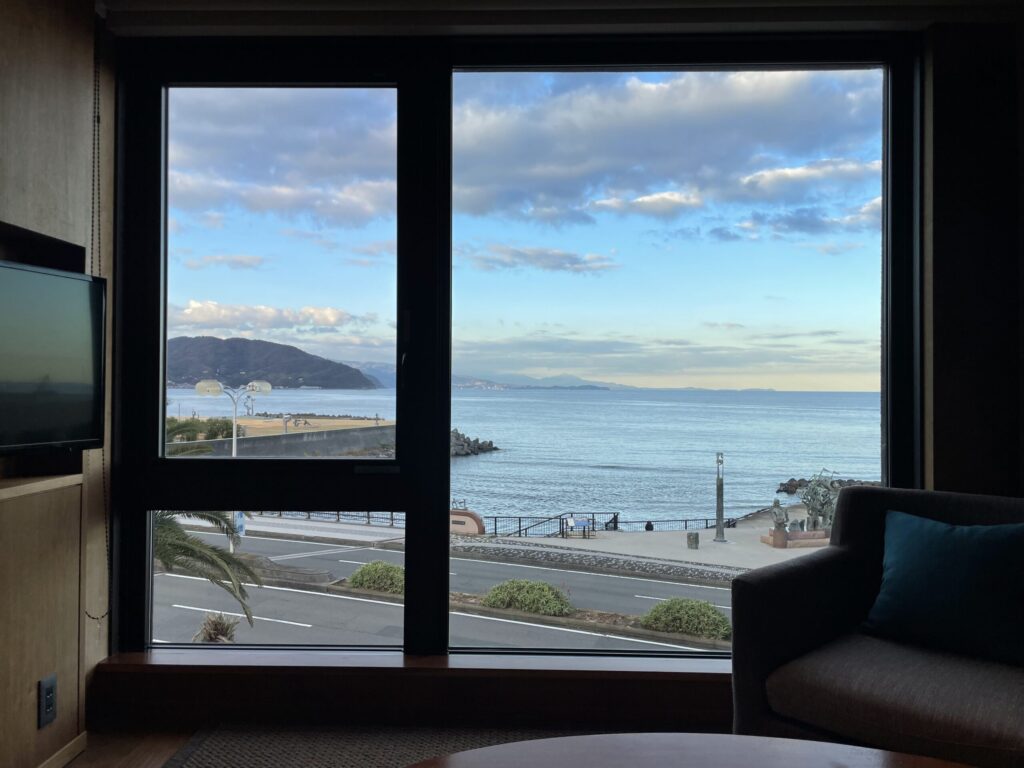 お部屋はオーシャンビューの大きな窓のお部屋でした。界アンジンは全部屋オーシャンビューになっているので、どのお部屋を予約しても海を眺めることができると思います。
