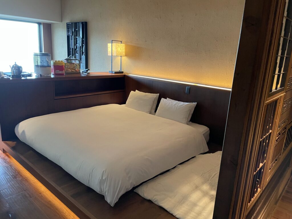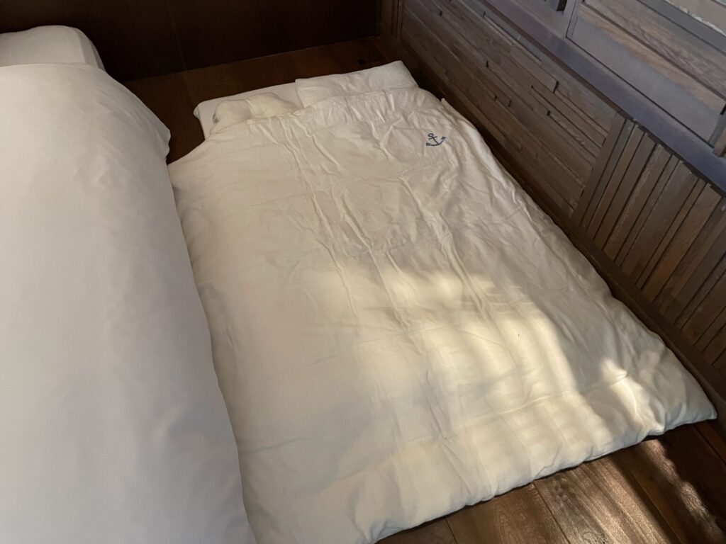 息子(2歳)はベッドの真ん中で寝て、娘(0歳)は赤ちゃん布団を宿からお借りしました。(赤ちゃん用の枕まで付いています。)