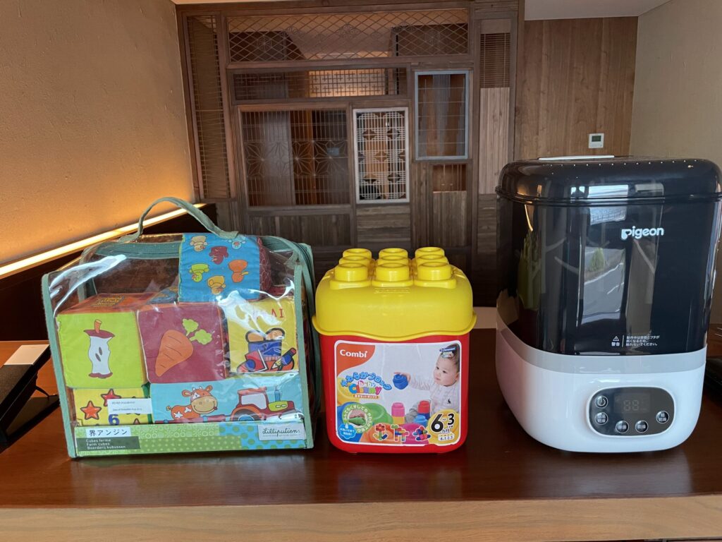 界アンジンではお部屋になんとおもちゃや哺乳瓶除菌セットまで用意されていました!特に子供用の除菌グッズは嵩張るし電子レンジで除菌をお願いしなきゃいけなかったりと、毎回面倒だったので部屋に用意してもらっていたのはとっても助かりました。