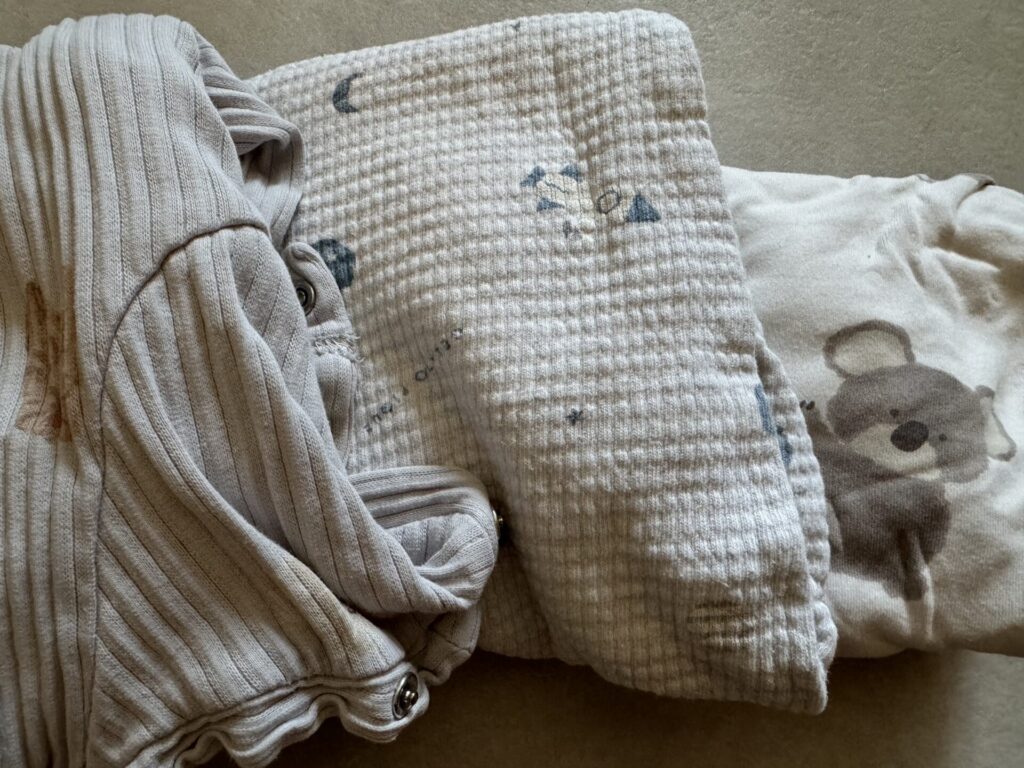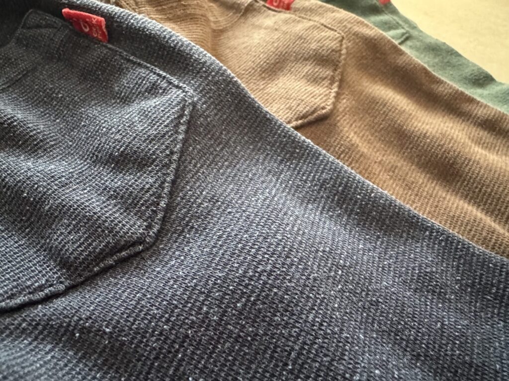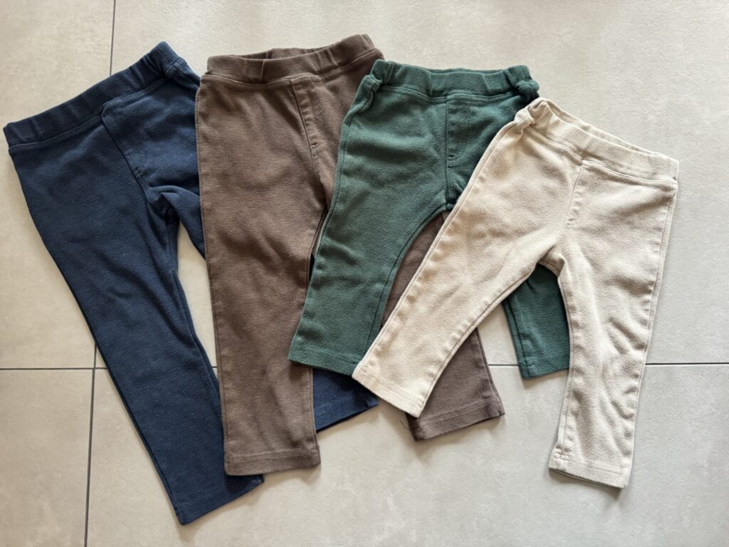 1年以上使った時の生地感はこんな感じ。(左は1年ほど、右はお下がりで下の子が来ているので2年目に突入です。)