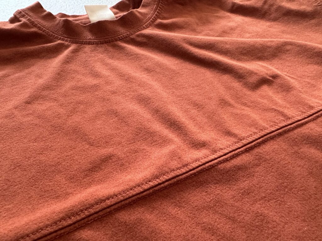 petit mainのTシャツ(下記写真の右側)もまだまだ着れそうです。こちらは白い生地だからか毛玉もあまり目立ちません。生地はデビロックのものに比べて柔らかめです。デビロックは基本ビックシルエットで作られているためか、同じサイズ感でもこちらを着た時は2年目はサイズが小さいかな?という印象になりました。