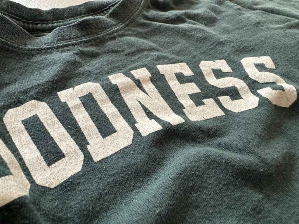 こちらが我が家で1年以上経過したTシャツです。少々毛玉は目立つものの、生地がへたってきれないということは全くなく、プリントも剥がれ落ちてきそう、ということはありません。(むしろ若干の風合いが出ていい感じになっている)